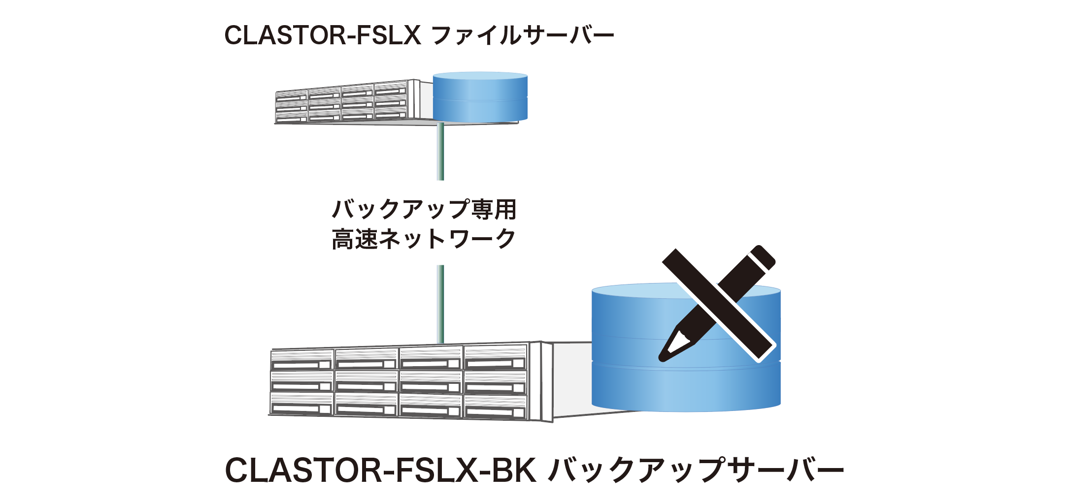 CLASTOR-FSLX-BKは、CLASTOR-FSLXファイルサーバーの同一機能を装備した上で、バックアップサーバーとして稼働します。ファイルサーバーのデータを毎日フルバックアップし、必要な日数分をバックアップサーバーに保存します。長期間のプロジェクトなどで、個別のファイル更新の遷移が日付ごとに確認できますので、データをさかのぼって確認したい場合などに便利です。ファイルサーバーに万一の障害が発生した場合、直ちに前日のバックアップを後悔し、事業を継続することが可能です。