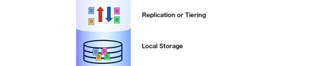 既存、新設のストレージをデータをそのままに、プール化。簡単に一つに統合したストレージスペースとして共有することが可能です。ローカルストレージの容量不足への対応や、複数の物理ストレージを論理的に単一のストレージスペースに構成する事から、ストレージの負荷分散が可能になります。